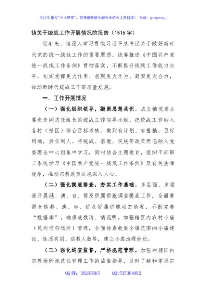 / 镇关于统战工作开展情况的报告(1516字)