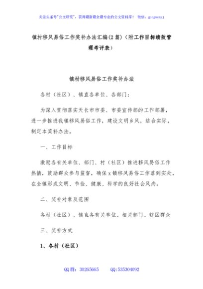 / (2篇)镇村移风易俗工作奖补办法汇编(附工作目标绩效管理考评表)