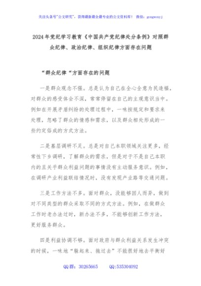 / 2024年党纪学习教育《中国共产党纪律处分条例》对照群众纪律、政治纪律、组织纪律方面存在问题