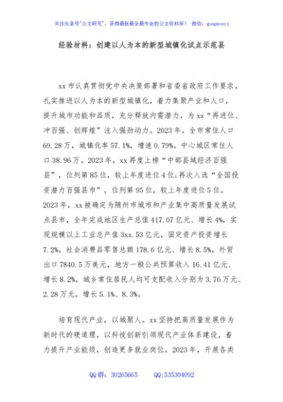 / 经验材料:创建以人为本的新型城镇化试点示范县