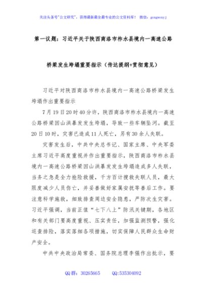 / 第一议题:习总书记关于陕西商洛市柞水县境内一高速公路桥梁发生垮塌重要指示(传达提纲+贯彻意见)