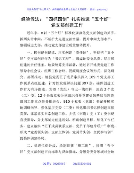/ 经验做法:“四抓四创”扎实推进“五个好”党支部创建工作
