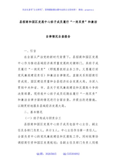 / 县招商和园区发展中心班子成员履行“一岗双责”和廉洁自律情况自查报告
