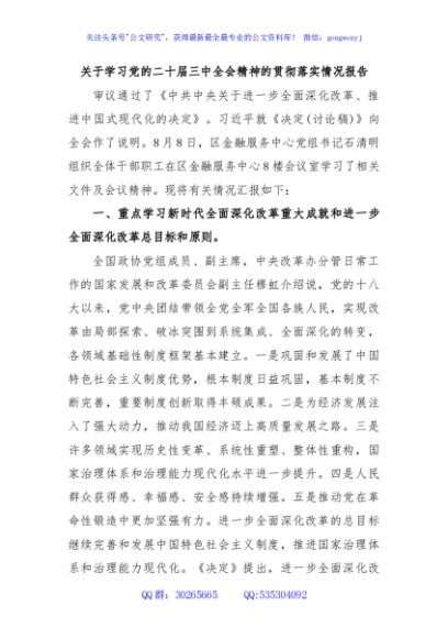 关于学习党的二十届三中全会精神的贯彻落实情况