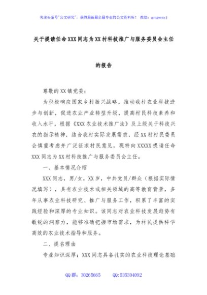 / 关于提请任命XXX同志为XX村科技推广与服务委员会主任的报告