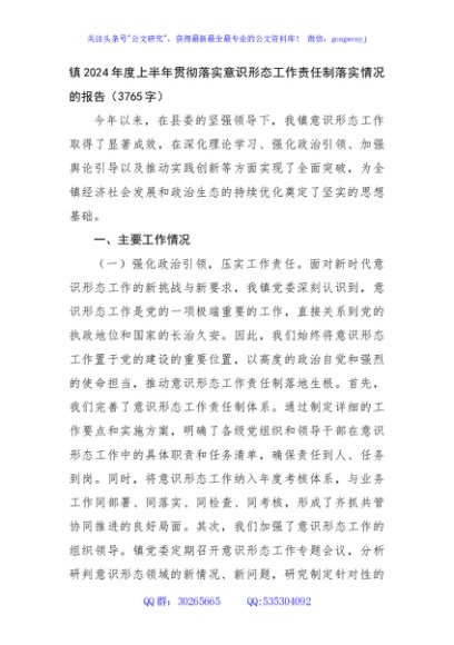 / 镇2024年度上半年贯彻落实意识形态工作责任制落实情况的报告(3765字)
