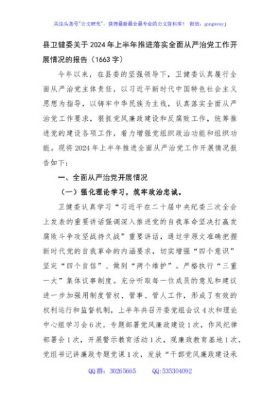 / 县卫健委关于2024年上半年推进落实全面从严治党工作开展情况的报告(1663字)