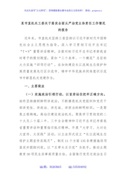 / 某市直机关工委关于落实全面从严治党主体责任工作情况的报告