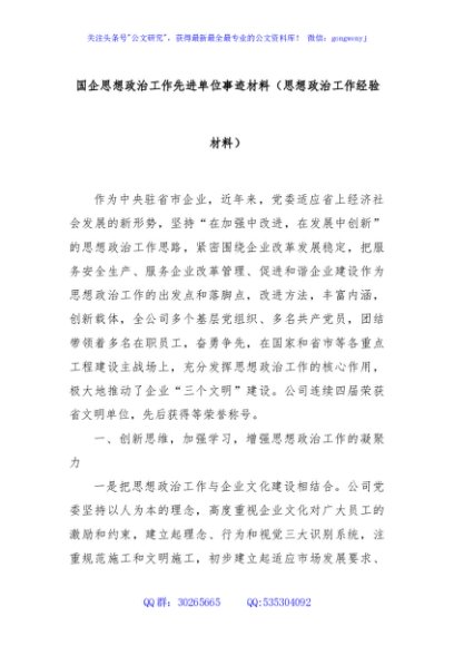 / 国企思想政治工作先进单位事迹材料(思想政治工作经验材料)