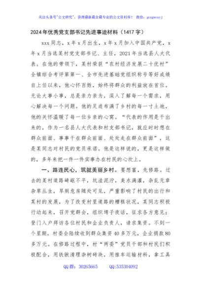 / 2024年优秀党支部书记先进事迹材料(1417字)