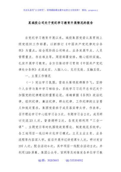 / 某城投公司关于党纪学习教育开展情况的报告