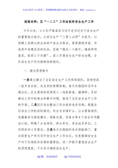 / 经验材料:区“一二三”工作法抓好安全生产工作