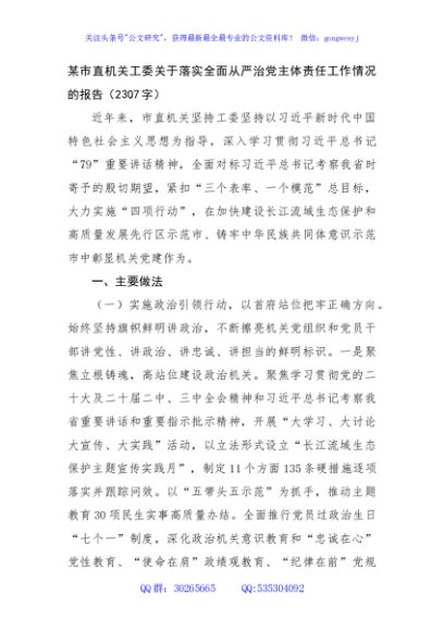 / 某市直机关工委关于落实全面从严治党主体责任工作情况的报告(2307字)