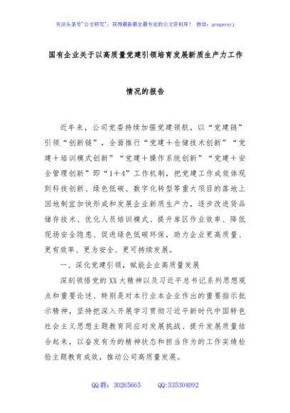 / 国有企业关于以高质量党建引领培育发展新质生产力工作情况的报告