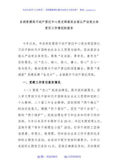 / 自然资源局不动产登记中心党支部落实全面从严治党主体责任工作情况的报告