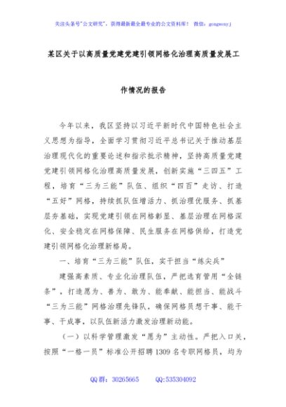 / 某区关于以高质量党建党建引领网格化治理高质量发展工作情况的报告
