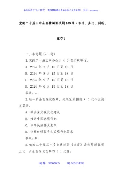 / 党的二十届三中全会精神测试题100道(单选、多选、判断、填空)