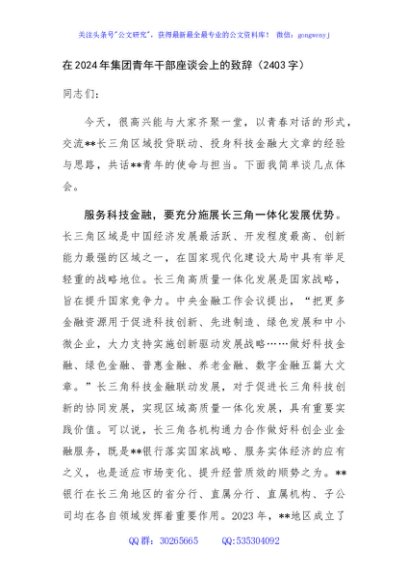 / 在2024年国企青年干部座谈会上的致辞(2403字)