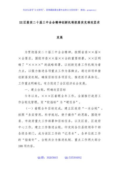 / XX区落实二十届三中全会精神创新机制抓落实克难攻坚求发展