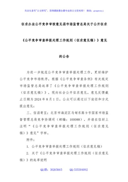 / 征求办法公平竞争审核意见函市场监管总局关于公开征求《公平竞争审查举报处理工作规则(征求意见稿)》意见的公告