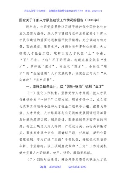 / 国企关于干部人才队伍建设工作情况的报告(3138字)
