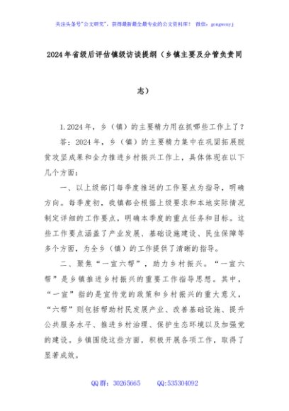/ 2024年省级后评估镇级访谈提纲(乡镇主要及分管负责同志)