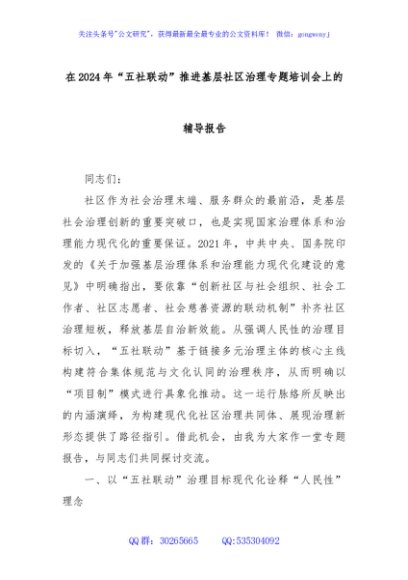 / 在2024年“五社联动”推进基层社区治理专题培训会上的辅导报告