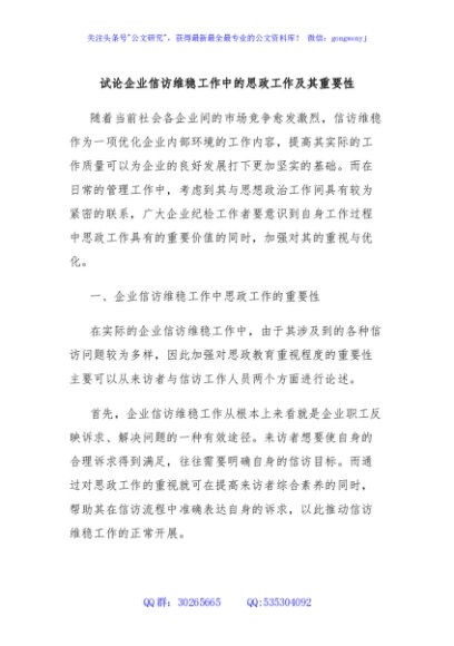 / 试论企业信访维稳工作中的思政工作及其重要性