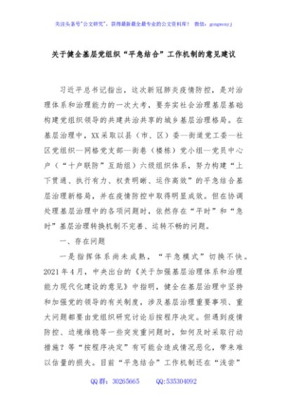 / 关于健全基层党组织“平急结合”工作机制的意见建议