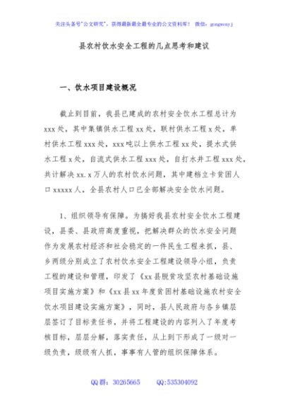 / 县农村饮水安全工程的几点思考和建议