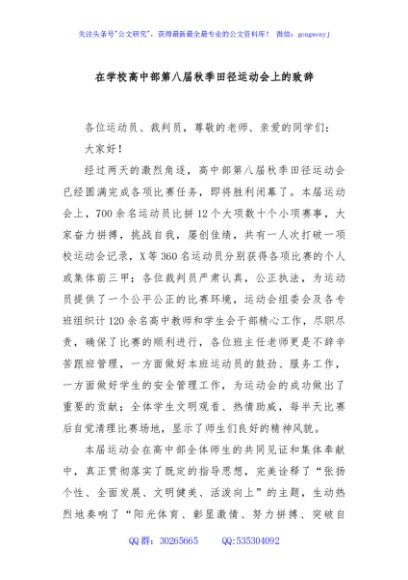 / 在学校高中部第八届秋季田径运动会上的致辞