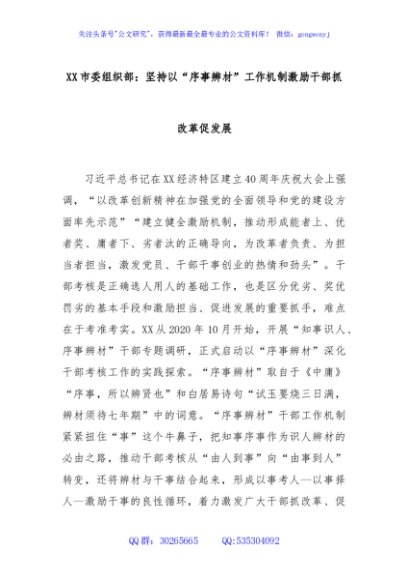 / XX市委组织部:坚持以“序事辨材”工作机制激励干部抓改革促发展