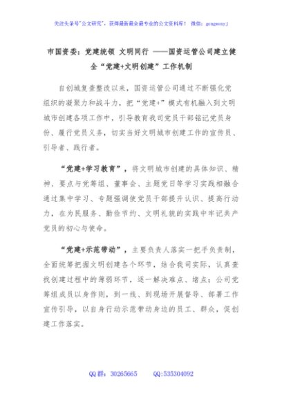 / 市国资委:党建统领 文明同行 ——国资运管公司建立健全“党建+文明创建”工作机制