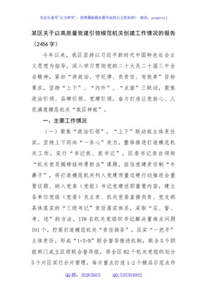 / 某区关于以高质量党建引领模范机关创建工作情况的报告(2456字)