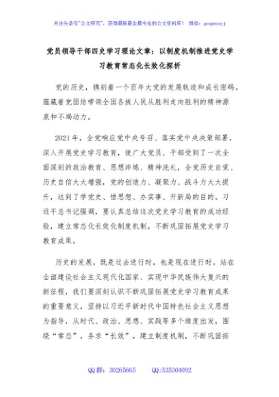 / 党员领导干部四史学习理论文章:以制度机制推进党史学习教育常态化长效化探析