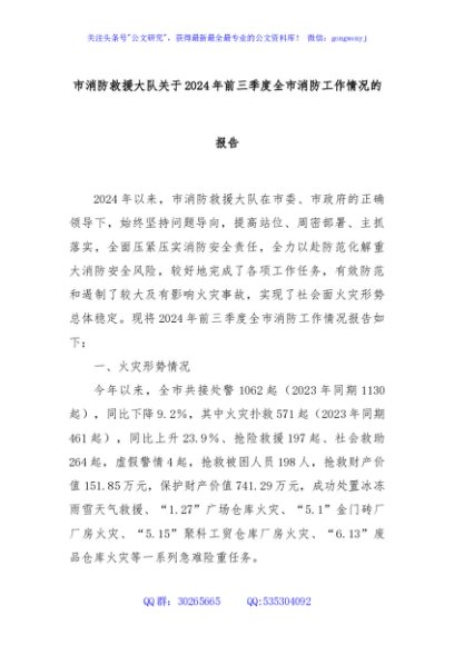 / 市消防救援大队关于2024年前三季度全市消防工作情况的报告