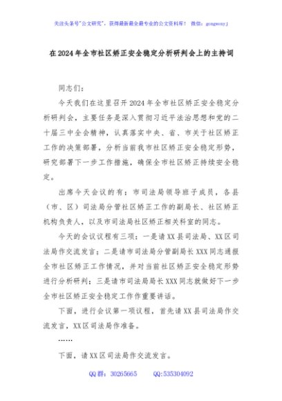 / 在2024年全市社区矫正安全稳定分析研判会上的主持词