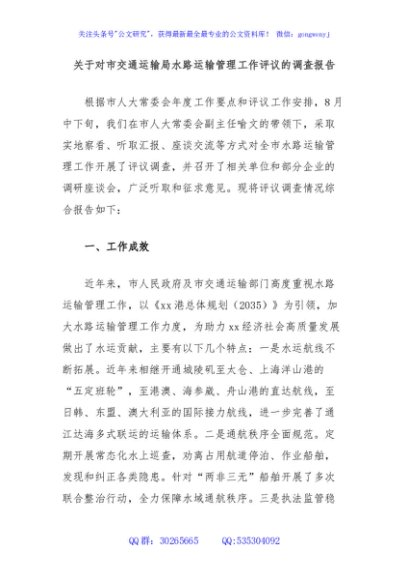 / 关于对市交通运输局水路运输管理工作评议的调查报告