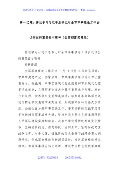 第一议题:传达学习习近平总书记对全军军事理论工作会议作出的重要指示精神(含贯彻落实意见)