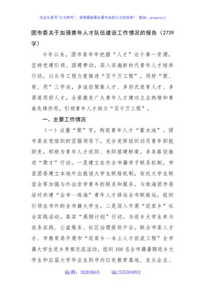/ 团市委关于加强青年人才队伍建设工作情况的报告(2739字)