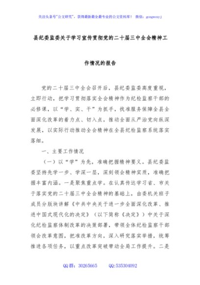 / 县纪委监委关于学习宣传贯彻党的二十届三中全会精神工作情况的报告