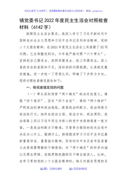 / 镇党委书记2022年度民主生活会对照检查材料