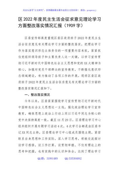 / 区2022年度民主生活会征求意见理论学习方面整改落实情况汇报