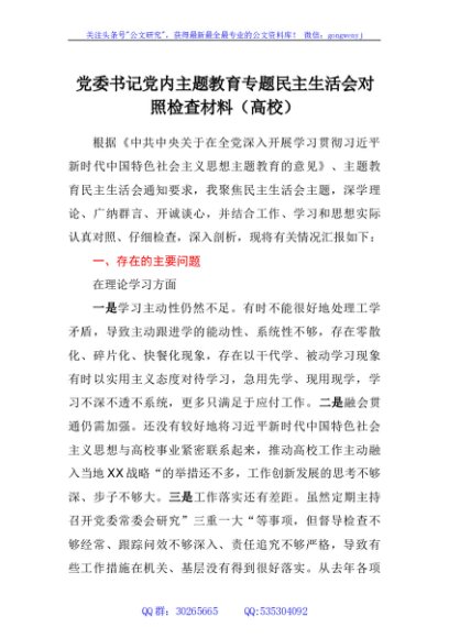 / 党委书记党内主题教育专题民主生活会对照检查材料(高校)