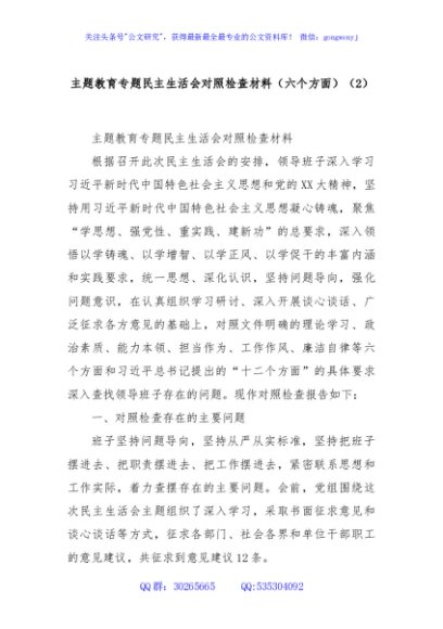/ 主题教育专题民主生活会对照检查材料(六个方面)(2)