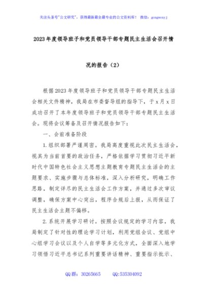 / 2023年度领导班子和党员领导干部专题民主生活会召开情况的报告