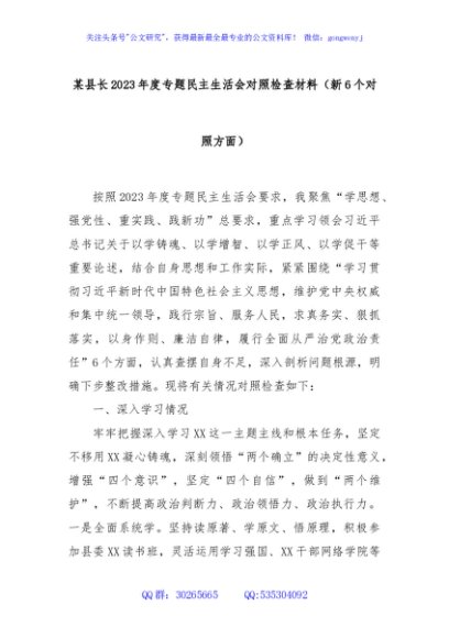 / 某县长2023年度专题民主生活会对照检查材料(新6个对照方面)
