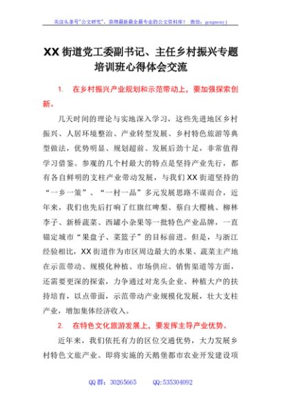 / 街道党工委副书记、主任乡村振兴专题培训班心得体会交流