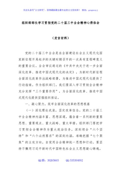 组织部部长学习贯彻党的二十届三中全会精神心得体会(发言材料)