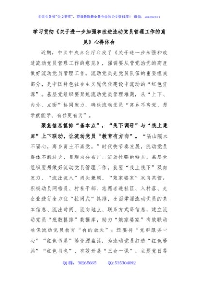 / 学习贯彻《关于进一步加强和改进流动党员管理工作的意见》心得体会